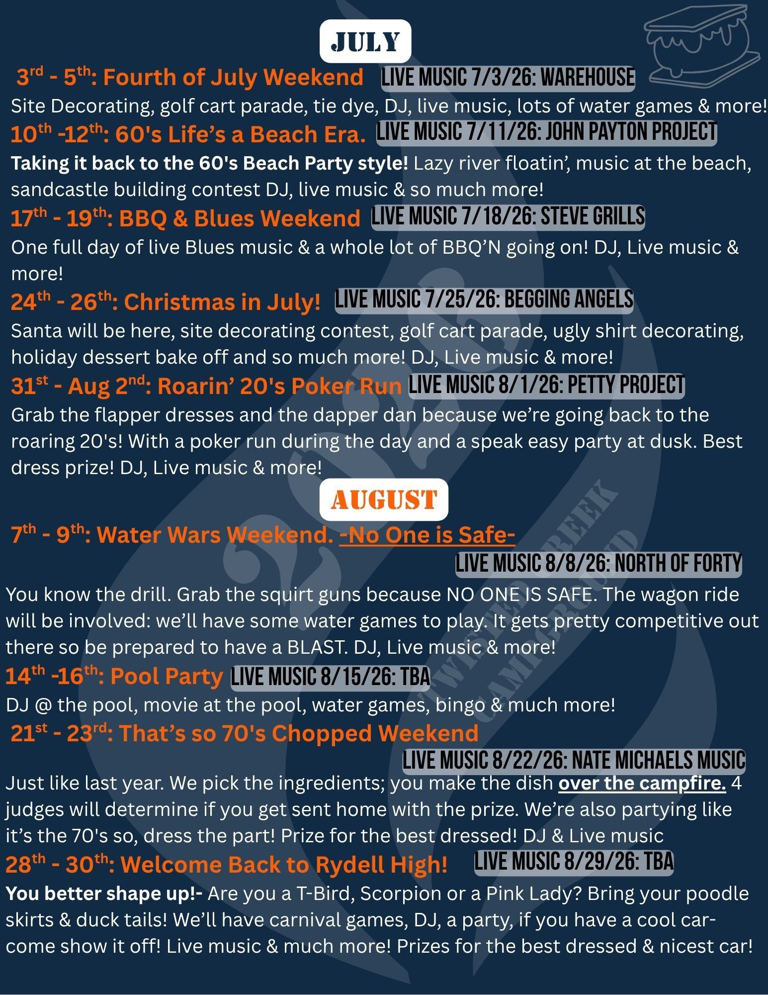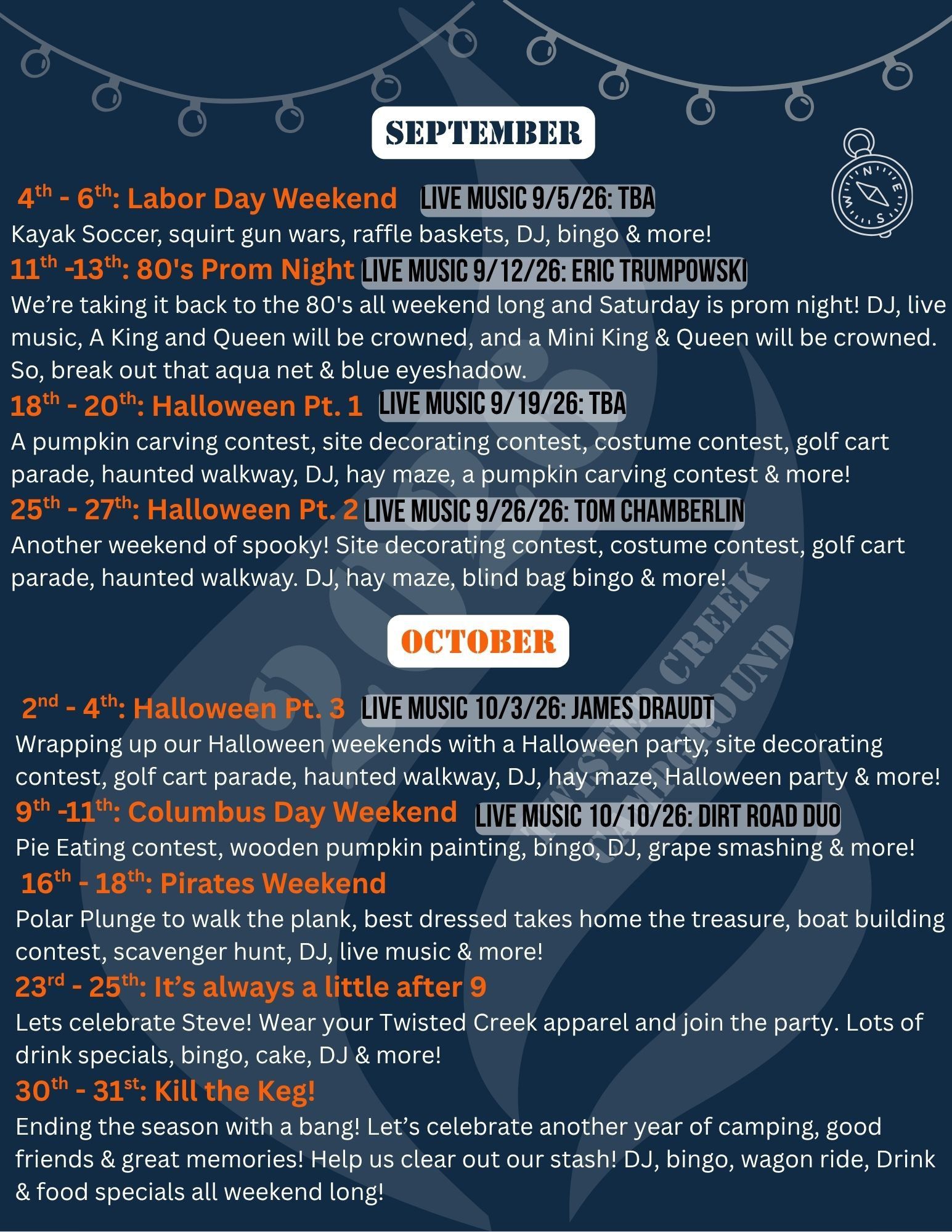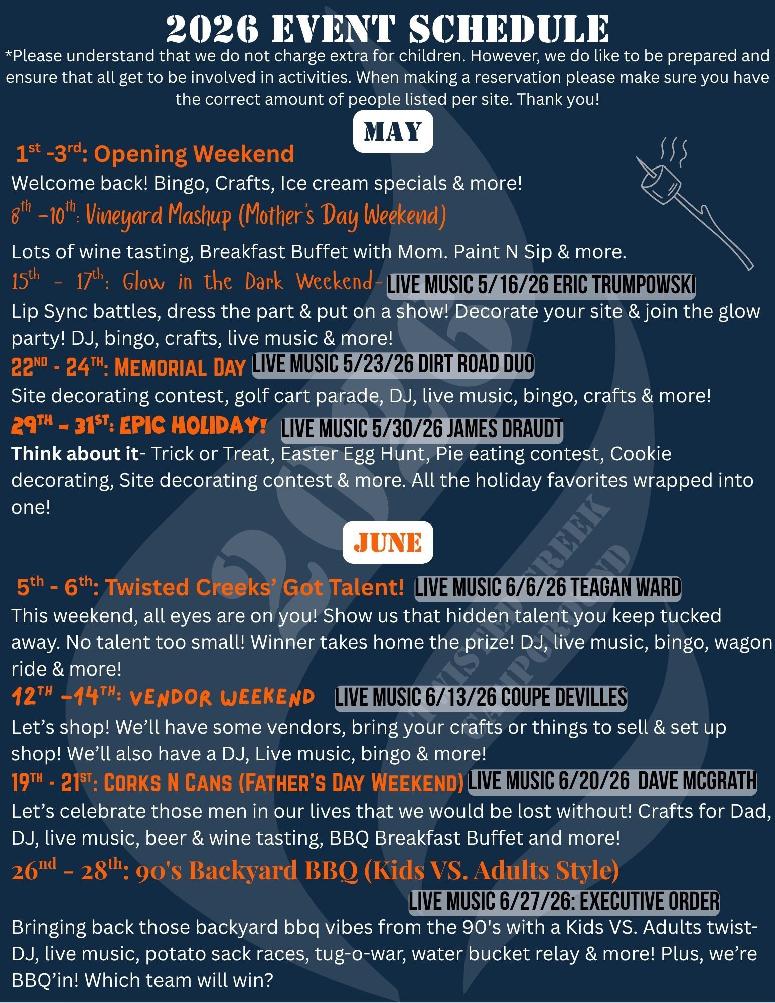 Get ready for a year full of excitement and entertainment at Twisted Creek Campground. Our 2026 calendar is bursting with events to make every stay memorable. From holiday celebrations to live music sessions, there's something for everyone. Mark your calendars for these not-to-be-missed events!